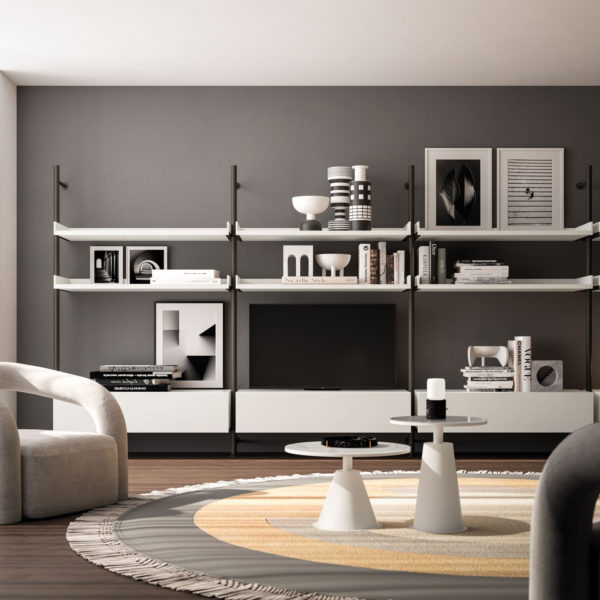 Esta composición de salón de diseño italiano apuesta por una estética etérea y minimalista, donde la ligereza visual es la protagonista absoluta. El mueble se define por una estructura de montantes verticales esbeltos en tono grafito que sostienen baldas suspendidas de un blanco inmaculado, creando un sistema abierto que parece flotar contra la pared. La base se completa con módulos de almacenaje suspendido de líneas puras, que ofrecen una solución limpia para los equipos multimedia. Es una pieza ideal para ambientes que buscan un equilibrio entre la funcionalidad de una librería y la libertad de un espacio despejado, aportando una pincelada de modernidad nórdica con el sello indiscutible de la sofisticación italiana.
