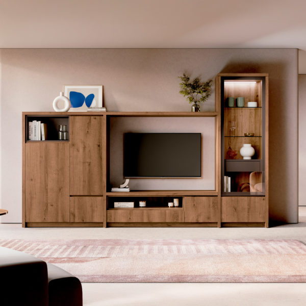 El conjunto de salón PALETA se distingue por su acabado integral en cálida madera con ricas vetas, ofreciendo un estilo robusto y acogedor. La composición se centra en el área de TV enmarcada, bajo la cual se encuentra un módulo con almacenamiento cerrado y nichos abiertos. A la izquierda, un módulo vertical combina puertas ciegas y estantes abiertos para libros y decoración. A la derecha, una elegante vitrina acristalada con iluminación interna permite exhibir tus objetos favoritos. PALETA es la solución perfecta para un salón que busca maximizar el almacenamiento con un diseño simétrico, sofisticado y atemporal.