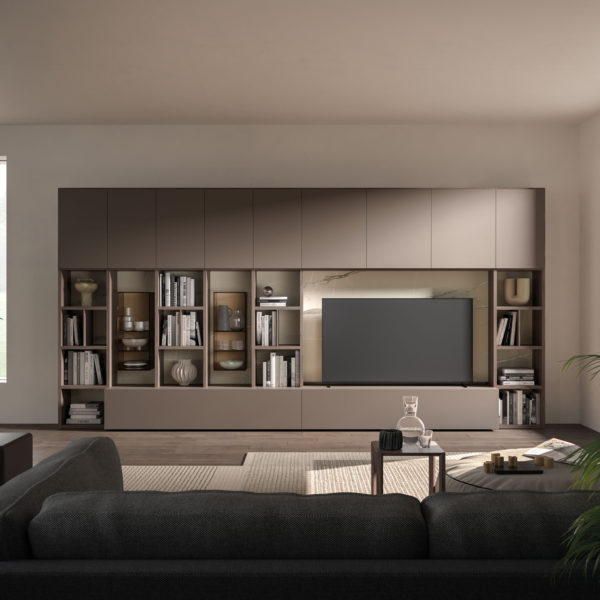 Esta composición de salón de diseño italiano representa la perfecta armonía entre el almacenamiento masivo y el arte de la exhibición. La pieza se distingue por su estructura de pared completa en un sofisticado tono arena, que integra una cuadrícula de estanterías abiertas con amplios módulos superiores e inferiores de puertas lisas para un aspecto limpio y ordenado. El diseño eleva la zona multimedia mediante un fondo de mármol crema con vetas doradas, flanqueado por delicadas vitrinas de cristal que añaden un punto de luz y transparencia al conjunto. Es una solución arquitectónica de lujo funcional que transforma el salón en un espacio de serenidad y distinción, ideal para quienes valoran la organización sin renunciar a una estética de alta gama.