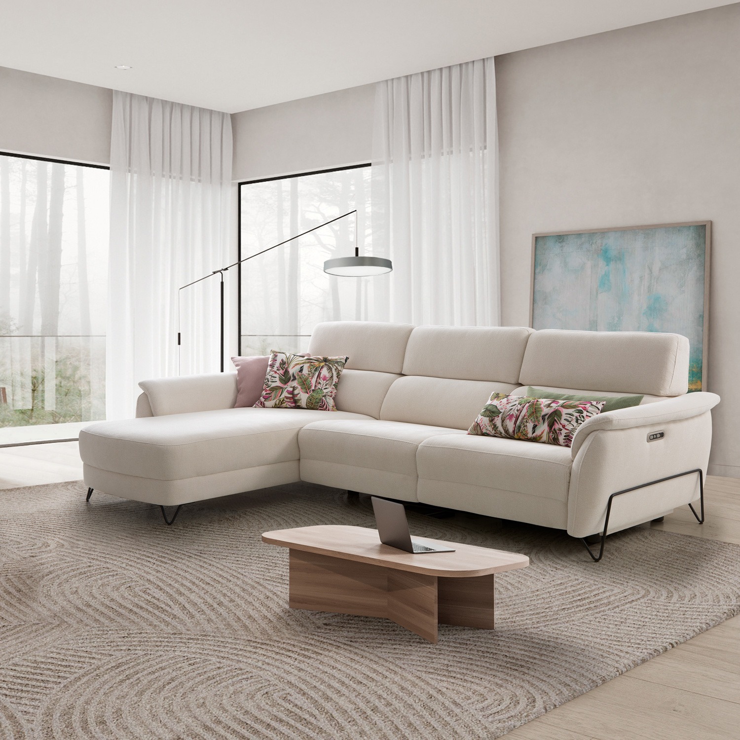 Este chaise longue redefine el concepto de elegancia contemporánea, combinando una presencia arquitectónica con una comodidad sin precedentes. Tapizado en una refinada tela de color gris piedra, su diseño se ve realzado por una vibrante composición de cojines lumbares en tonos granate, caldero y azul petróleo, que añaden un carácter dinámico y sofisticado al conjunto. La estructura se apoya sobre unas audaces patas metálicas de diseño geométrico que fluyen hacia los reposabrazos, creando un contraste visual moderno y robusto. Perfecto para estancias amplias y luminosas, este modelo no solo ofrece una amplia zona de relax para toda la familia, sino que se posiciona como una pieza de diseño icónica capaz de dotar de personalidad y calidez a cualquier hogar de estilo vanguardista.