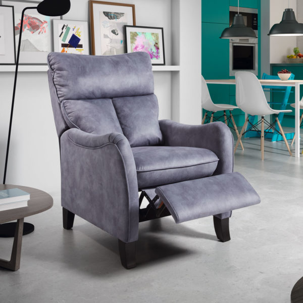 Confort y estilo se unen en este elegante sillón reclinable, el complemento perfecto para tu salón o rincón de lectura. Tapizado en un sofisticado tono gris azulado, su diseño de líneas suaves y cojines mullidos promete un descanso inigualable. Al activar su mecanismo reclinable, el reposapiés se eleva suavemente, ofreciéndote un oasis de relajación. Sus patas de madera oscura le confieren un toque de distinción que encaja a la perfección con decoraciones modernas y minimalistas, como se aprecia en el ambiente abierto y luminoso que lo rodea. Ideal para disfrutar de una película, un buen libro o simplemente para desconectar después de un largo día.