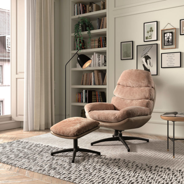 Impresionante y moderno, este sillón relax con ottoman redefine el confort y el estilo. Tapizado en una rica y texturizada tela color rosa palo o terracota suave, su diseño ergonómico de paneles acolchados ofrece un soporte excepcional. Cuenta con una base giratoria metálica en negro mate que añade un toque vanguardista. Acompañado de su reposapiés a juego, este conjunto es la pieza central ideal para crear un rincón de lectura o descanso con una estética sofisticada y contemporánea.