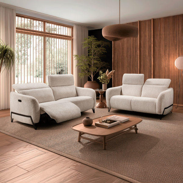Moderniza tu salón con este conjunto de sofás que combinan diseño escandinavo y máxima funcionalidad. Tapizados en tejido bouclé color crema, aportan textura y luminosidad. Sus respaldos son ajustables para un confort cervical óptimo y la base en contraste negro con patas delgadas añade un toque contemporáneo. Además, el sofá de tres plazas incluye una función reclinable para extender los reposapiés, ofreciendo estilo y un descanso superior en un solo mueble.