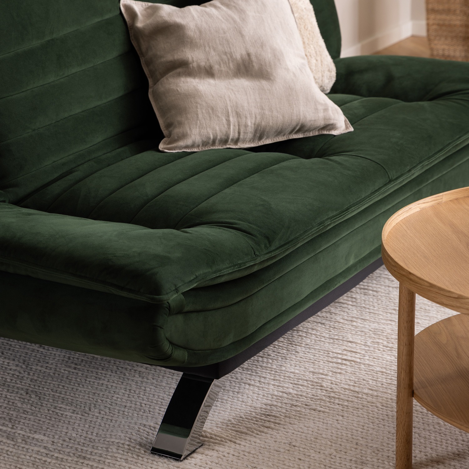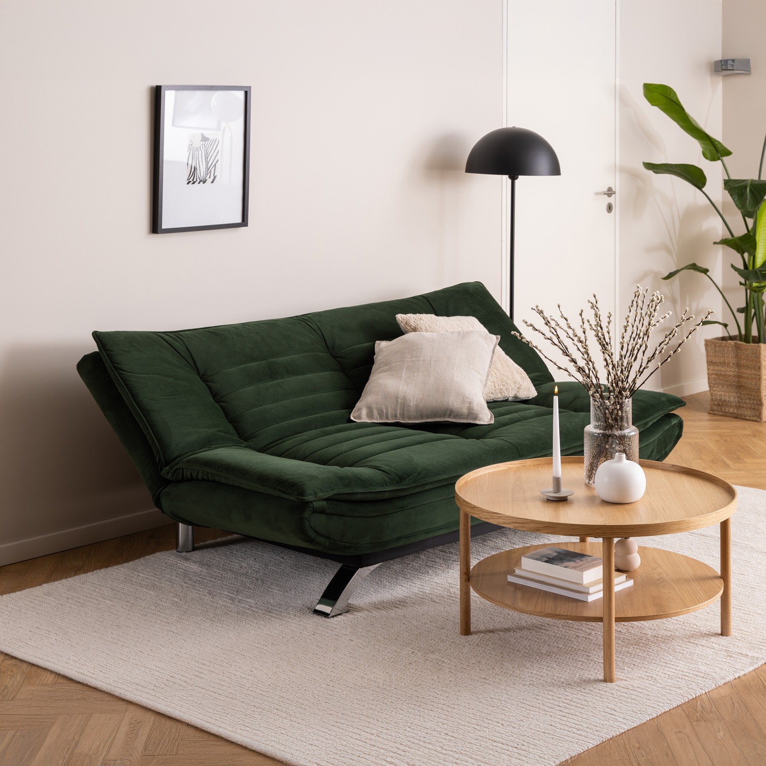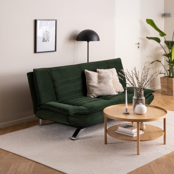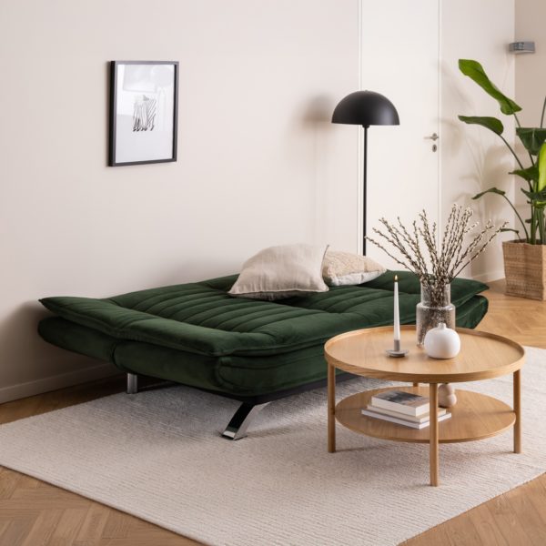 Sofá cama con base de acero pintado en polvo negro mate, mecanismo clic & clack y elegantes costuras horizontales. Tapizado sobre una estructura sólida que garantiza durabilidad y confort.